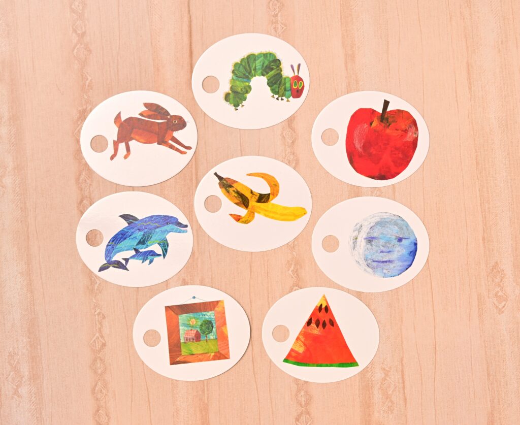 生き物や食べ物、自然や身近な道具など、エリック・カールの美しいイラストや鮮やかなアートで色や形を表現した「いろかたちカード」です。