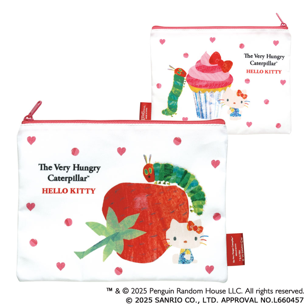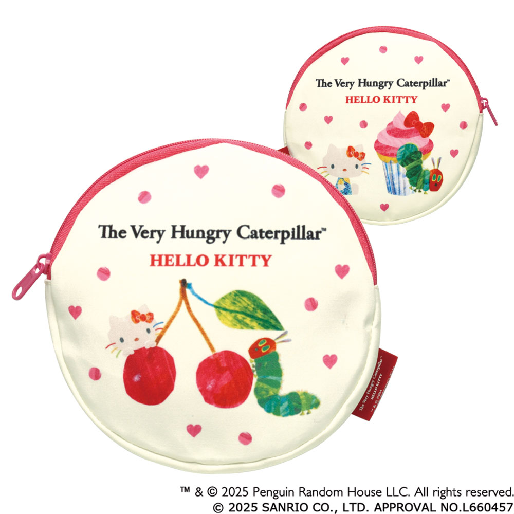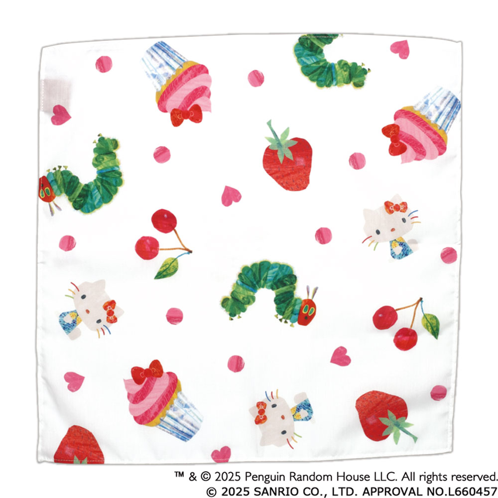 いちごやさくらんぼ、キティのリボンが乗ったカップケーキを今にもむしゃむしゃ食べてしまいそうな「はらぺこあおむし」がとても愛らしく描かれています。