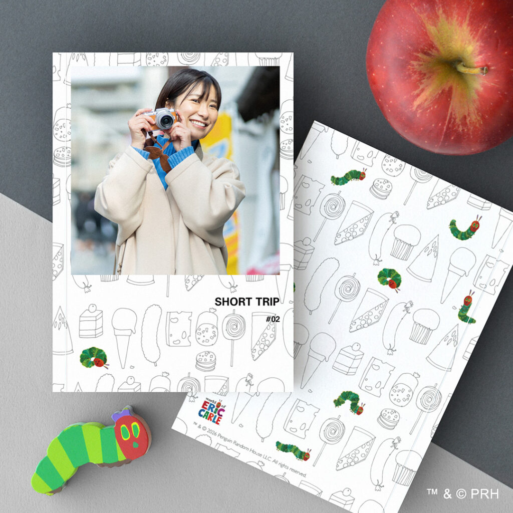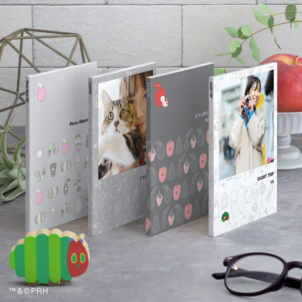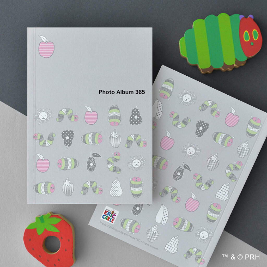 グレーの背景に、はらぺこあおむしに登場するフルーツを不規則に配置したパターン表紙。線画のみのシンプルな構成は写真が主役のアルバムに!裏面中央の赤いリンゴのメッセージイラストが思い出を愛おしく演出します。