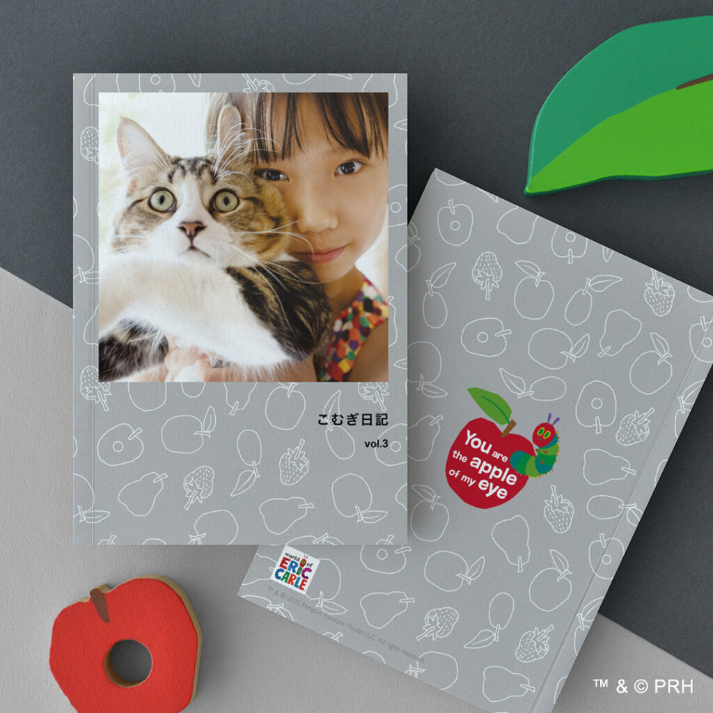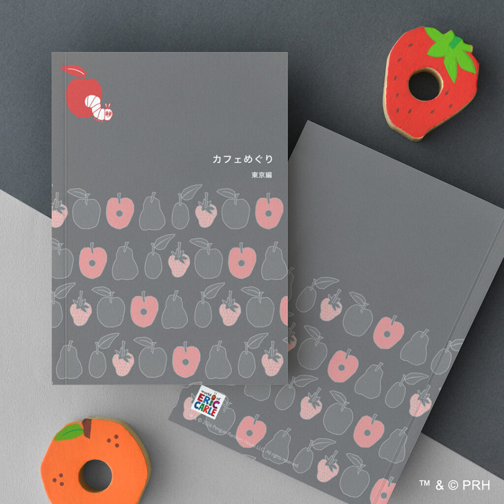 濃いグレーの背景に、はらぺこあおむしが最初に食べたフルーツが並ぶパターン表紙。モノトーンと上品なスモーキーピンクでオシャレなデザインに仕上げました。表面のリンゴから出てくるあおむしのイラストがアクセントです。